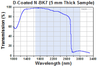 - 这些透镜镀有1.65 - 3.0 µm波段的增透膜,然而,N-BK7玻璃的透过率在比2.3 µm长的波长下有所下降。关于透过率和反射率曲线图,请参看曲线标签。