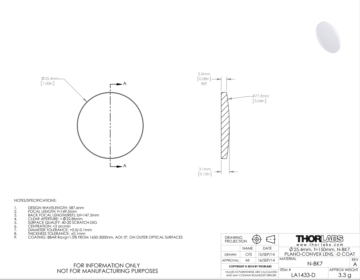 Thorlabs索雷博 LA1433-D 平凸透镜