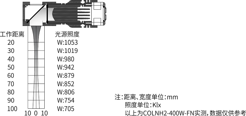 调光为100%时,工作距离50mm时的理论值,实际数值可能存在出入
