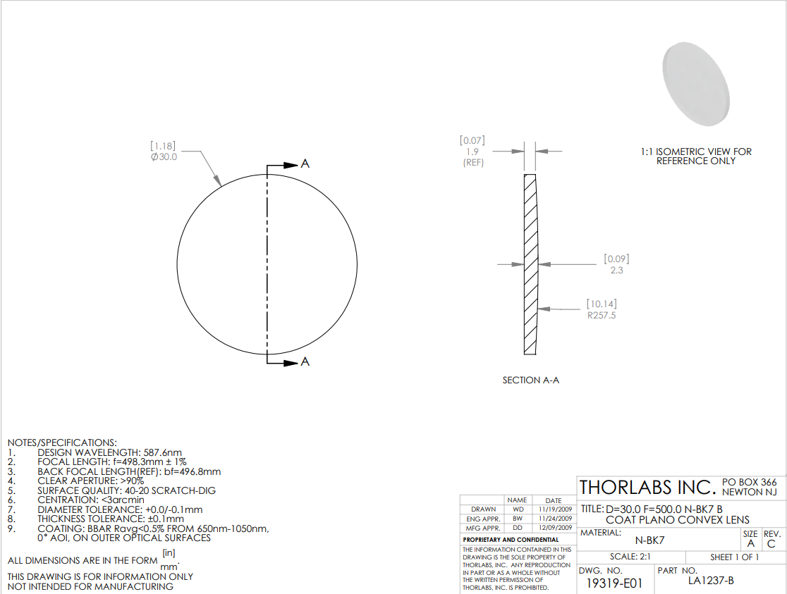 其中n是折射率,R是透镜表面的曲率半径。这些透镜使用阿贝数为64.17的N-BK7材料生产;阿贝数是色散指标。