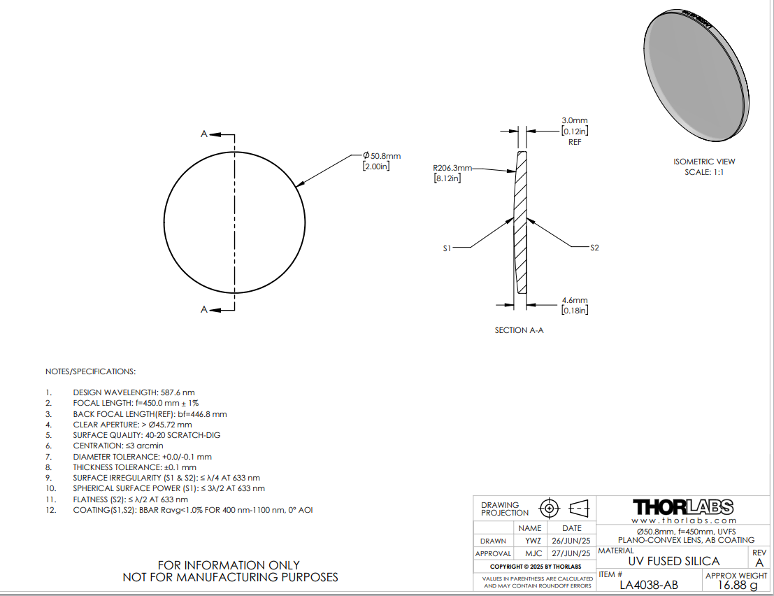Thorlabs索雷博 LA4038-AB 紫外熔融石英平凸球透镜