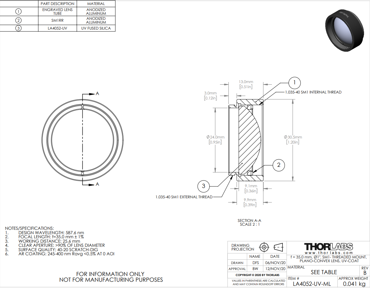 透镜直径 | Ø1/2" 螺纹安装座(SM05螺纹规格) (0.535"-40) SM1-螺纹接口中的"Ø1" (1.035"-40) SM2螺纹安装中的Ø2 (2.035"-40) Ø75毫米 SM3螺纹接口 (3.035"-40) |