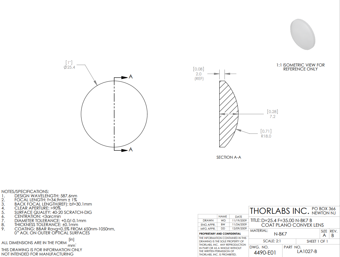 其中n是折射率,R是透镜表面的曲率半径。这些透镜使用阿贝数为64.17的N-BK7材料生产;阿贝数是色散指标。