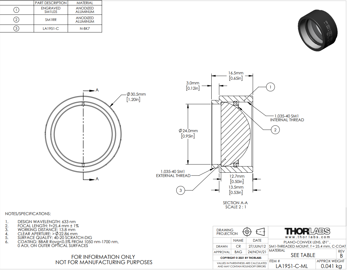 这些平凸透镜由N-BK7材料制造,它是符合RoHS标准的BK7玻璃,并且镀有增透膜,在1050 - 1620 nm或1050 - 1700 nm波长范围上提供每个表面< 0.5%的平均反射率。N-BK7是制造高性能光学元件最广泛使用的光学玻璃之一。当紫外熔融石英的额外好处(即良好的紫外透过率和较低的热膨胀系数)不那么必要时,通常会选择该材料。这些Ø1/2英寸、Ø1英寸、Ø1.5英寸和Ø2英寸的透镜分别安装在兼容SM05-(0.535"-40)、SM1-(1.035"-40)、SM1.5(1.535"-40)和SM2-(2.035"-40)螺纹的安装座上,从而兼容我们的SM螺纹透镜套管。每个透镜套筒都刻有型号,透镜类型,焦距和指向透镜弯曲表面的箭头,以及增透膜范围。