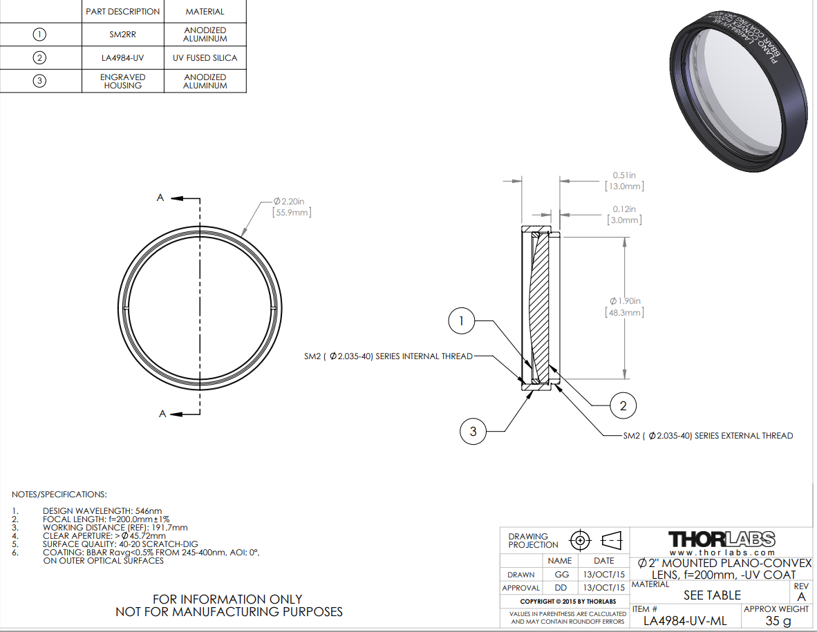 透镜直径 | Ø1/2" 螺纹安装座(SM05螺纹规格) (0.535"-40) SM1-螺纹接口中的"Ø1" (1.035"-40) SM2螺纹安装中的Ø2 (2.035"-40) Ø75毫米 SM3螺纹接口 (3.035"-40) |
