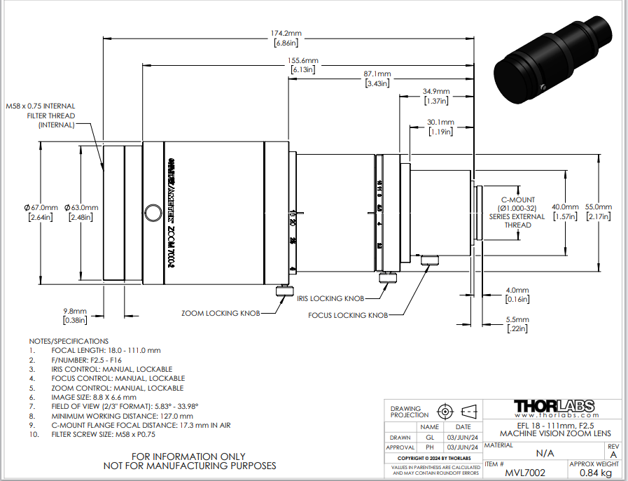 MVL7002微距镜头带有一个可拆卸的近摄镜头,用于5.00英寸(127.0 mm)到12。00英寸(304.8 mm)之间的成像。拆卸之后,MVL7002可对19.70英寸(500.4 mm)至无限远的物体成像。镜头的对焦、光圈和变焦均可手动调节和锁定。