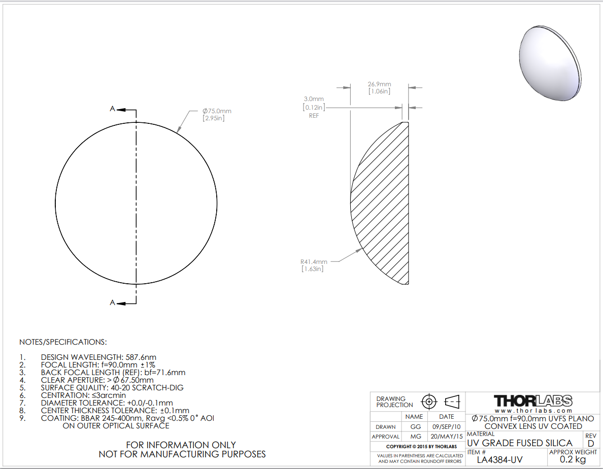 Thorlabs索雷博 LA4384-UV 平凸透镜