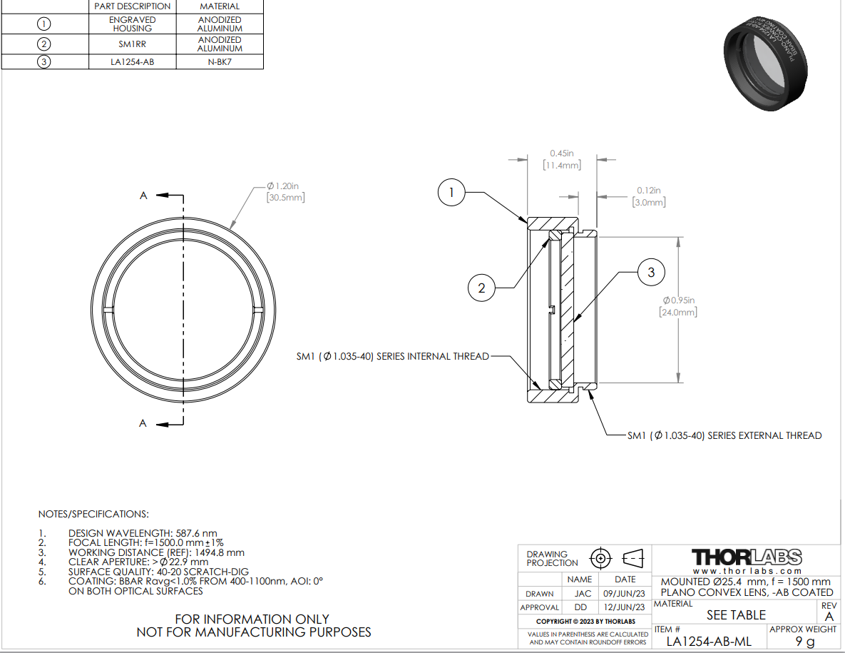 这些平凸透镜由符合RoHS标准的N-BK7材料制成,且镀有增透(AR)膜,在400 nm - 1100 nm波长范围内提供每个表面< 1.0%的平均反射率。N-BK7通常用于不需要紫外熔融石英的高级性能(如在紫外波段的高透过率和较低的热膨胀系数)的应用场合。这些Ø1/2英寸、Ø1英寸、Ø1.5英寸和Ø2英寸的透镜分别安装在兼容SM05(0.535"-40)、SM1(1.035"-40)、SM1.5 (1.535"-40)和SM2(2.035"-40)螺纹的安装座中,从而兼容我们的SM螺纹透镜套筒。SM螺纹卡环用于将透镜固定在安装座中。每个安装座都刻有产品型号、透镜类型、焦距、指向透镜曲面的箭头以及增透膜范围。