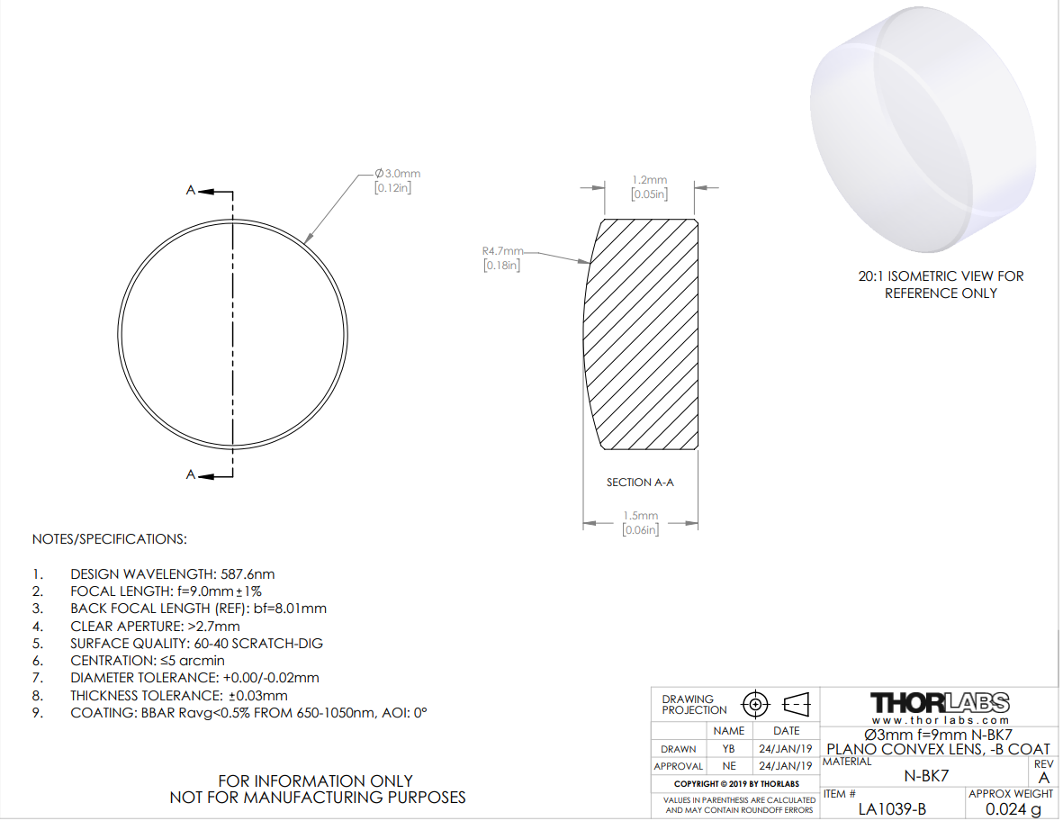 这些平凸透镜使用符合RoHS标准的BK7(N-BK7)生产,且镀有650-1050 nm波长范围的增透膜。当不需要紫外熔融石英的额外优点(一直到UV波段都具有高透过率且热膨胀系数更低)时,一般都会选择N-BK7玻璃。它们的焦距为正,对于无限远和有限远共轭比应用,性能接近最佳外形透镜。