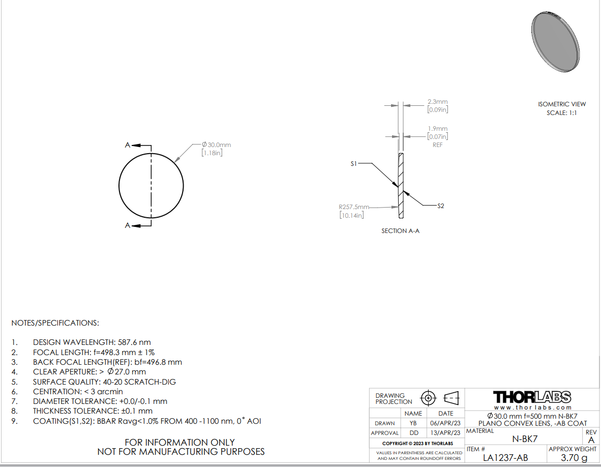 Thorlabs索雷博 LA1237-AB 平凸透镜