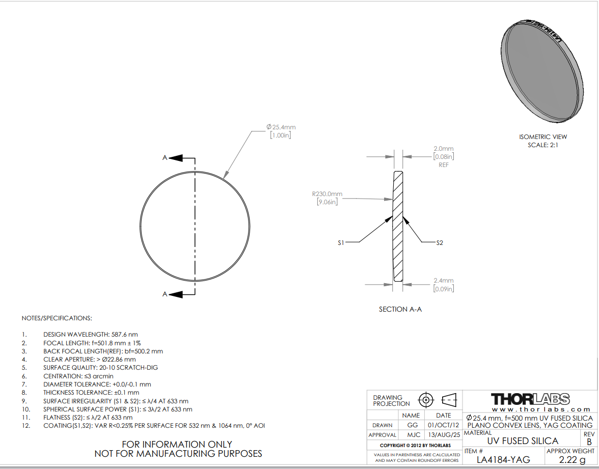 Thorlabs索雷博 LA4184-YAG 紫外熔融石英平凸球透镜