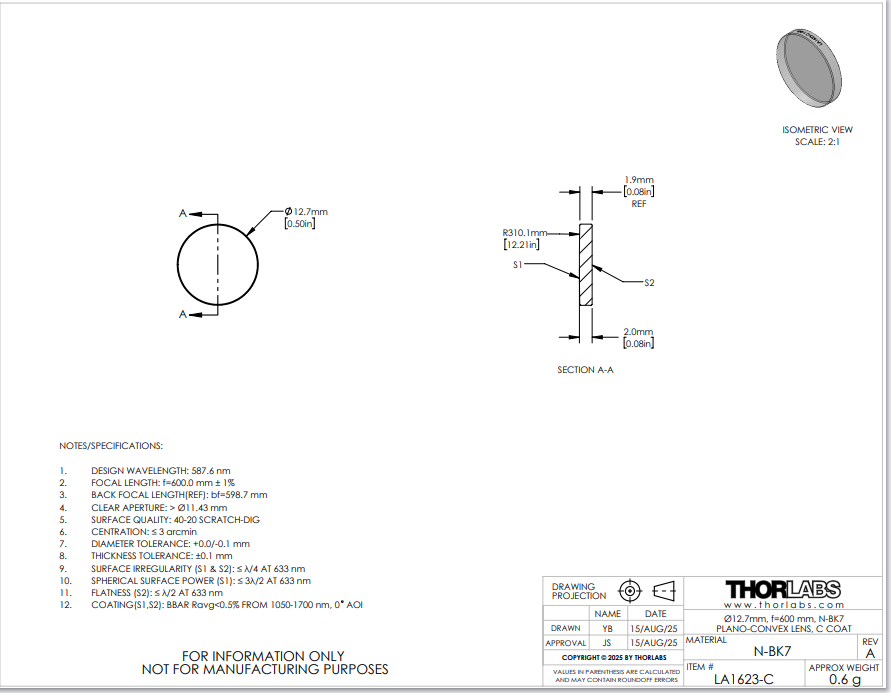 Thorlabs索雷博 LA1623-C 平凸透镜