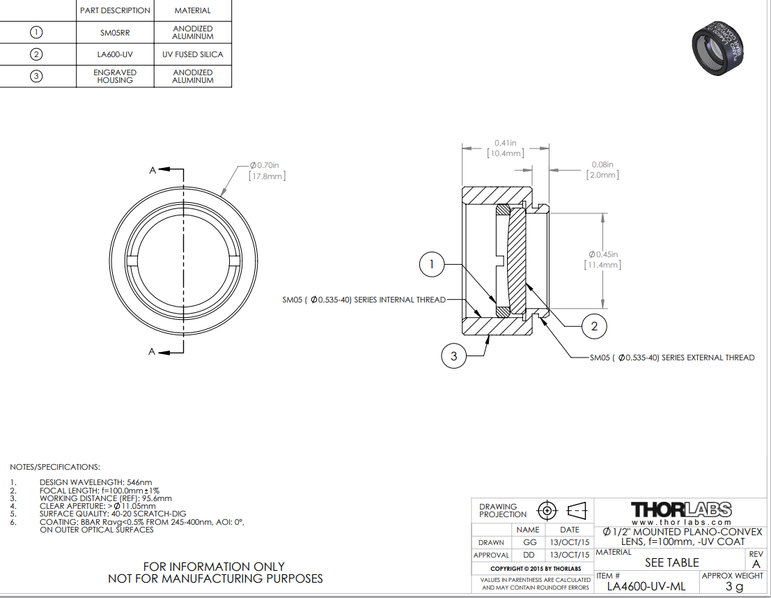 透镜直径 | Ø1/2" 螺纹安装座(SM05螺纹规格) (0.535"-40) SM1-螺纹接口中的"Ø1" (1.035"-40) SM2螺纹安装中的Ø2 (2.035"-40) Ø75毫米 SM3螺纹接口 (3.035"-40) |