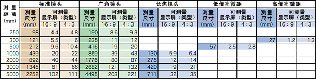 主要距离对应的 测量尺寸 (尺寸/ 距离) | 约98mm / 250mm | 约145mm / 200mm | 约115mm / 900mm | 约57mm / 500mm (固定) | 约27mm / 300mm (固定) |
