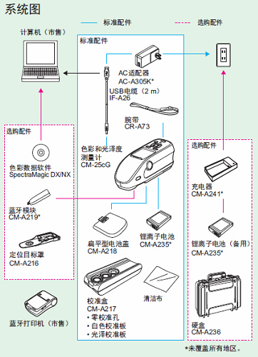 选购配件 | 硬盒、充电器和备用电池、定位目标罩、Bluetooth®模块、 SpectraMagic™ DX软件 |