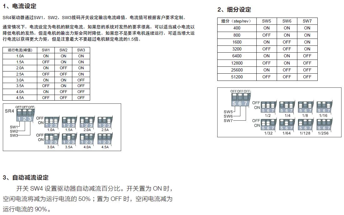 SR 系列两相步进电机驱动器是基于PID 电流控制算法设计的高性价比细分型驱动器,具有优越的性能表现,高速大力矩输出,低噪音,低振动,低发热,特别适合OEM 客户的大批量应用场合。SR4 驱动器可通过拨码开关选择运行电流和细分,有8 种细分,8 种电流供选择,具有过压,欠压,相电流和总电过流保护,其输入输出控制信号均采用光电隔离。