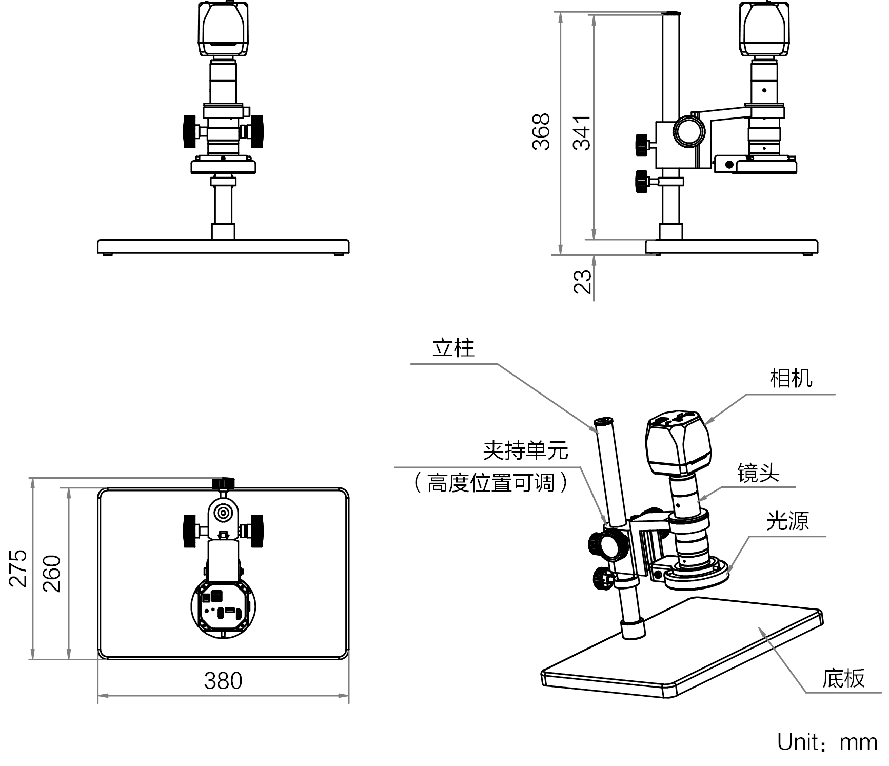 外形尺寸 | 相机:75 mm × 75 mm × 86.9 mm 镜头:Φ58 mm × 166.3 mm 光源:Φ97 mm × 123.5 mm 底座:380 mm × 260 mm × 23 mm 立柱:Φ25 mm × 341 mm |