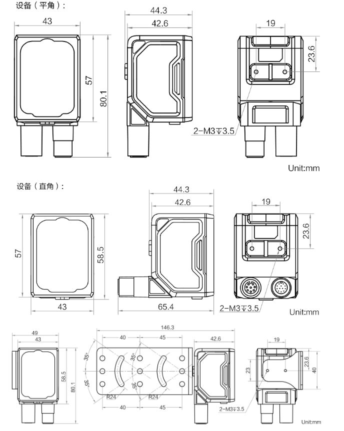 外形尺寸 | 平角:80.1 mm × 43 mm × 44.3 mm 直角:58.5 mm × 43 mm × 65.4 mm |