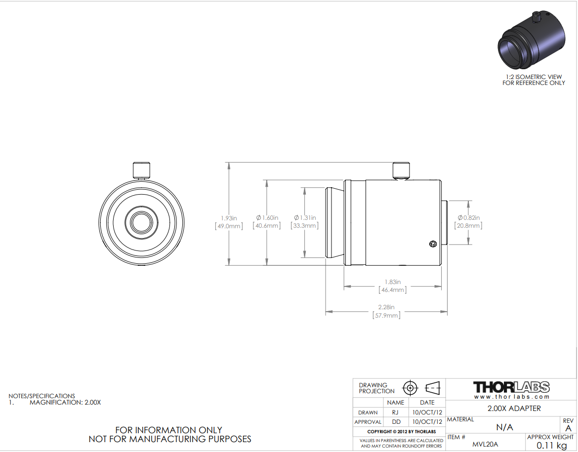 MVL20A - 2.00X延长套筒,用于6.5X和12X变焦镜头