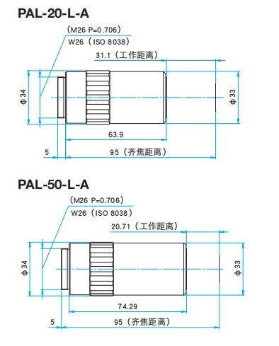 可用于同轴观察或激光导入光学系统等,是无限共轭的齐焦距离为95mm的长工作距离物镜。