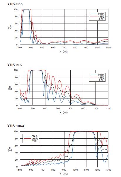 依据波长,分离或合成YAG激光(1064nm)与谐波转换后激光(355nm,532nm)时使用。备有不同反射率波长特性的3种类型。
