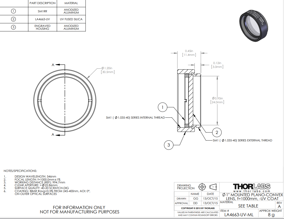 透镜直径 | Ø1/2" 螺纹安装座(SM05螺纹规格) (0.535"-40) SM1-螺纹接口中的"Ø1" (1.035"-40) SM2螺纹安装中的Ø2 (2.035"-40) Ø75毫米 SM3螺纹接口 (3.035"-40) |