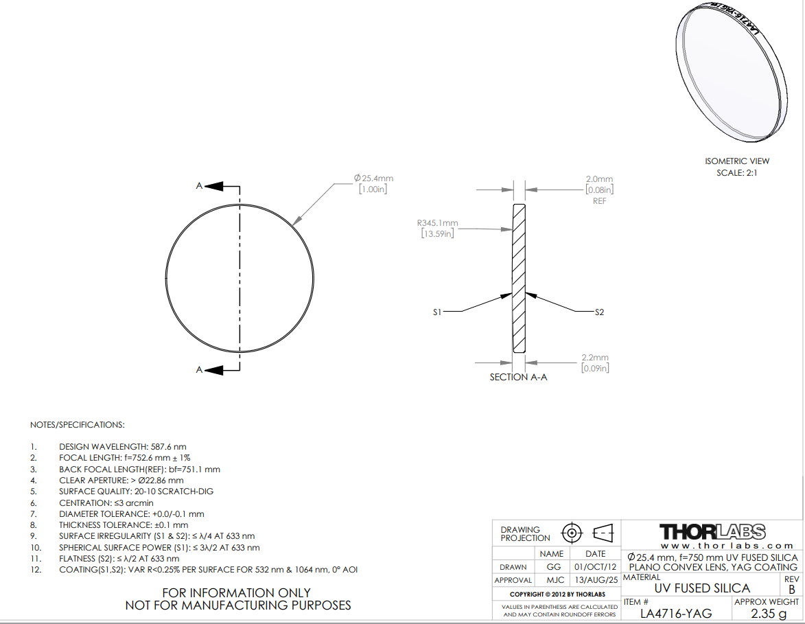 Thorlabs索雷博 LA4716-YAG 紫外熔融石英平凸球透镜
