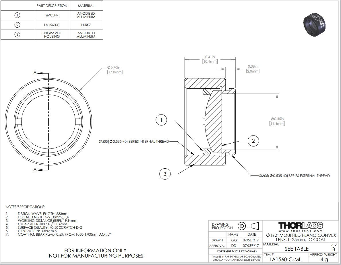 这些平凸透镜由N-BK7材料制造,它是符合RoHS标准的BK7玻璃,并且镀有增透膜,在1050 - 1620 nm或1050 - 1700 nm波长范围上提供每个表面< 0.5%的平均反射率。N-BK7是制造高性能光学元件最广泛使用的光学玻璃之一。当紫外熔融石英的额外好处(即良好的紫外透过率和较低的热膨胀系数)不那么必要时,通常会选择该材料。这些Ø1/2英寸、Ø1英寸、Ø1.5英寸和Ø2英寸的透镜分别安装在兼容SM05-(0.535"-40)、SM1-(1.035"-40)、SM1.5(1.535"-40)和SM2-(2.035"-40)螺纹的安装座上,从而兼容我们的SM螺纹透镜套管。每个透镜套筒都刻有型号,透镜类型,焦距和指向透镜弯曲表面的箭头,以及增透膜范围。
