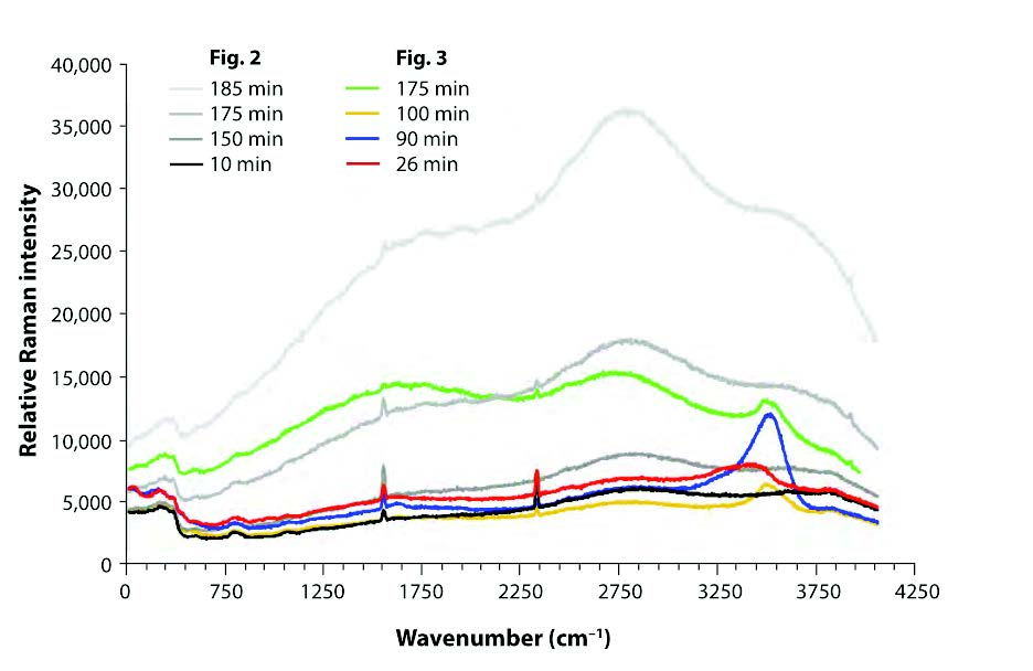 图 反应气体的拉曼光谱强度- 时间关系图和热刨面图