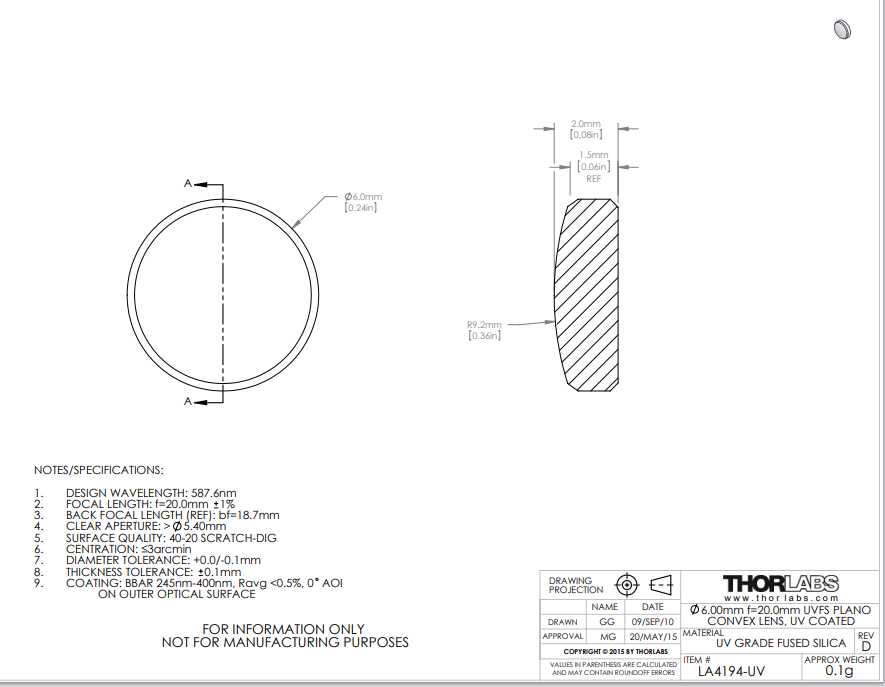 其中,n是折射率,R是透镜表面的曲率半径。这些透镜由阿贝数为67.82的紫外级熔融石英制成;阿贝数是色散指标。