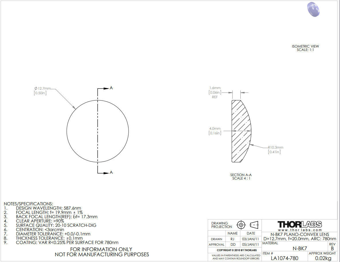 这些平凸透镜采用N-BK7玻璃制造,其V激光增透膜工作波长为780 nm,用于脉冲输出高达10 J/cm2的常用高功率半导体激光器。N-BK7是一种常用于高功率光学元件的光学玻璃。它通常用于不需要紫外熔融石英的高级性能(如在紫外波段的高透射率和较低的热膨胀系数)的应用场合。