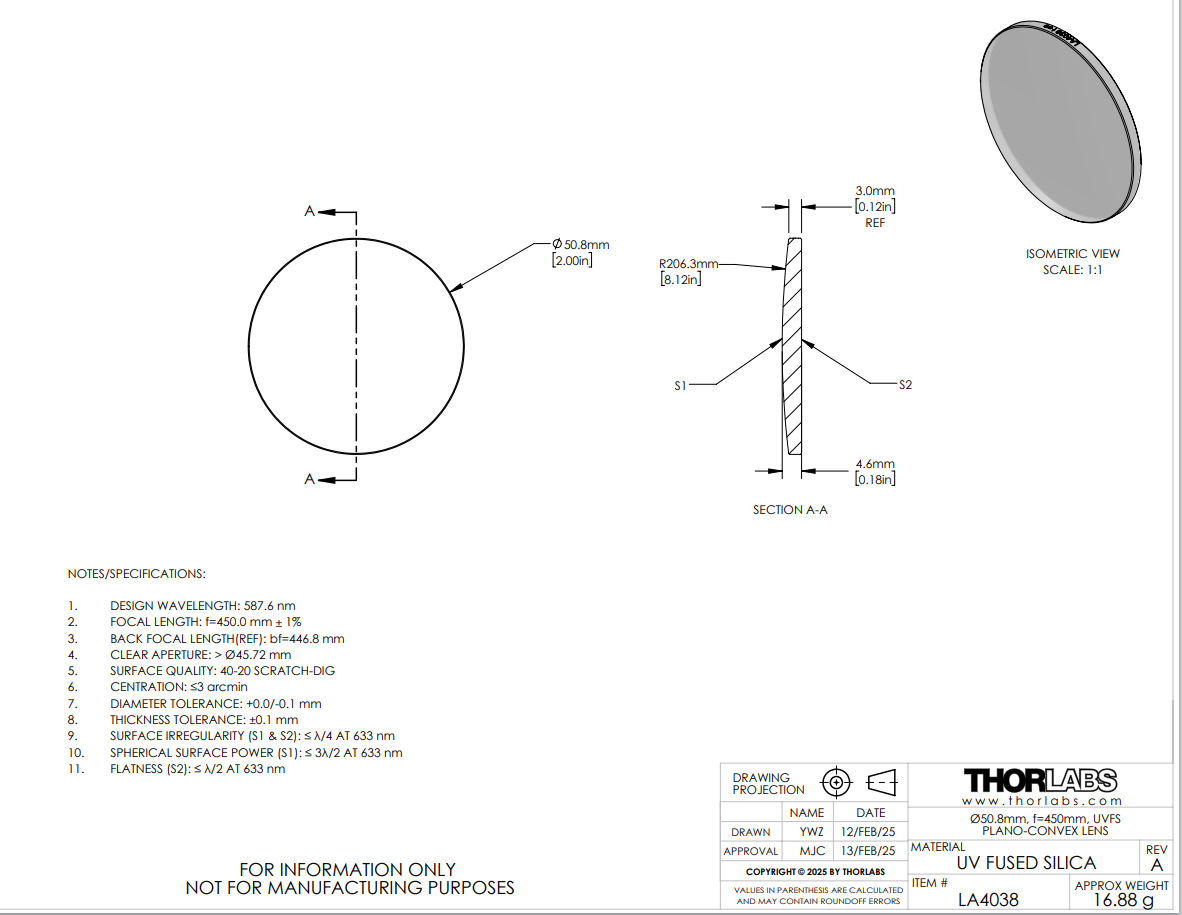 Thorlabs索雷博 LA4038 平凸透镜