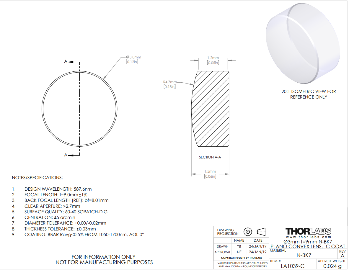Thorlabs索雷博 LA1039-C 平凸透镜
