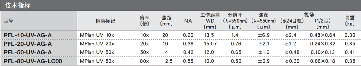 ▶倍率为使用f=200mm管镜时的数值。使用其他厂商生产的显微镜管镜时倍率有可能不同。首先要确认使用成像管镜的焦距,从管镜焦距和物镜焦距的比例来求出实际倍率。