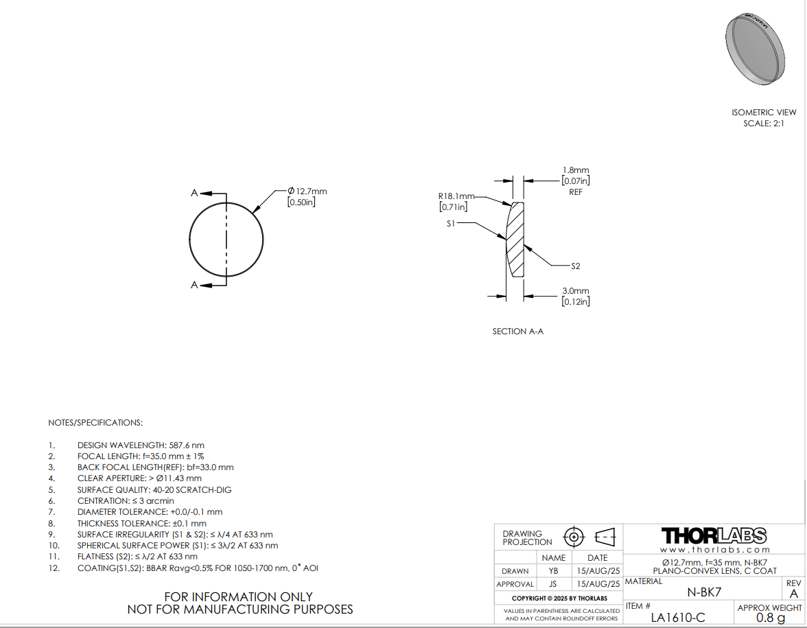 - LA1907-C、LA1541-C、LA1832-C、LA1419-C和LA1237-C透镜的设计波长为632.8纳米。