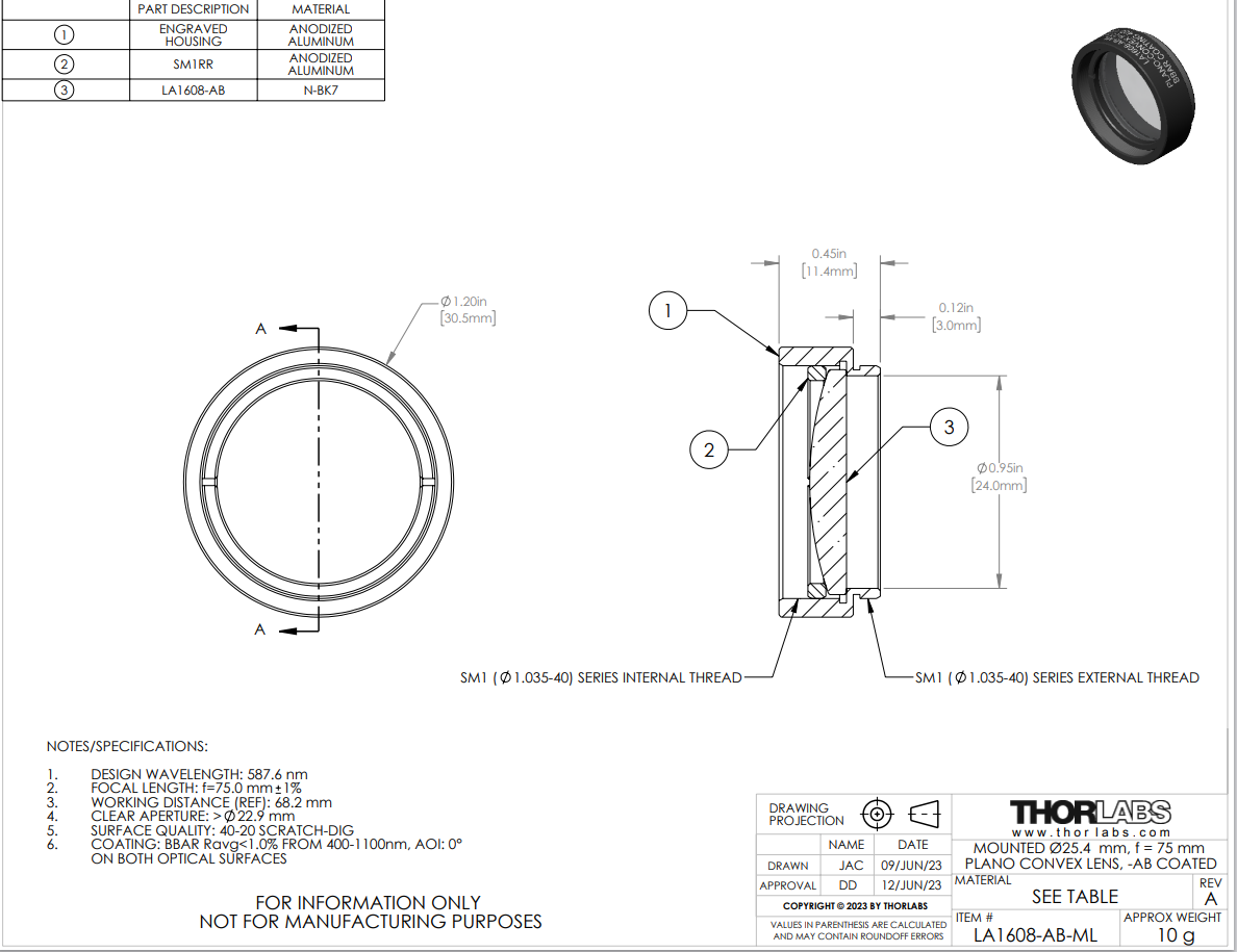 Thorlabs索雷博 LA1608-AB-ML 平凸透镜