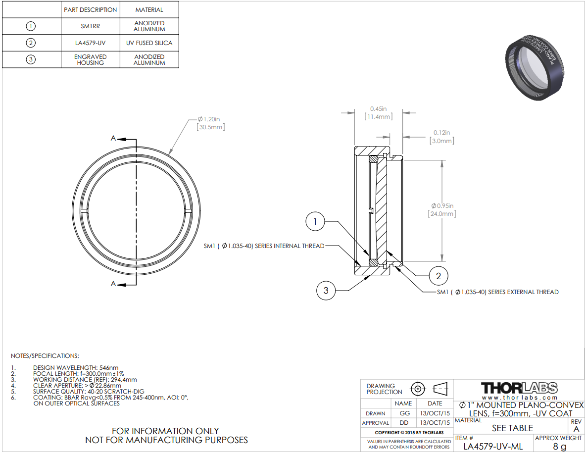 Thorlabs索雷博 LA4579-UV-ML 平凸透镜