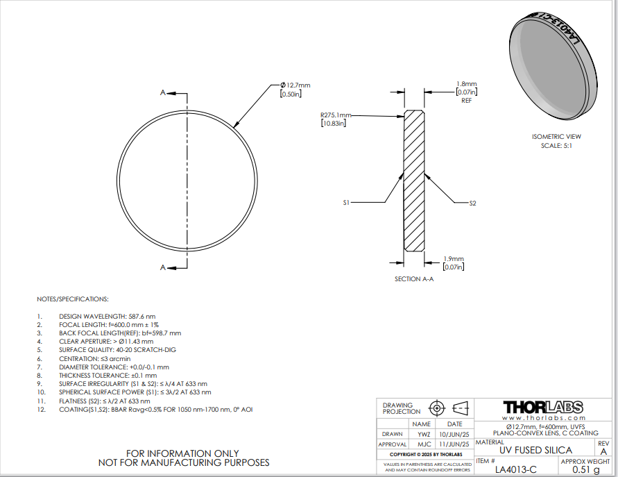 Thorlabs索雷博 LA4013-C 紫外熔融石英平凸球透镜