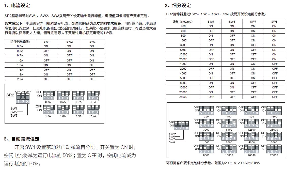 SR 系列两相步进电机驱动器是基于PID 电流控制算法设计的高性价比细分型驱动器,具有优越的性能表现,高速大力矩输出,低噪音,低振动,低发热,特别适合OEM 客户的大批量应用场合。SR2 驱动器可通过拨码开关选择运行电流和细分,有16 种细分,8 种电流供选择,具有过压,欠压,相电流过流保护,其输入输出控制信号均采用光电隔离。
