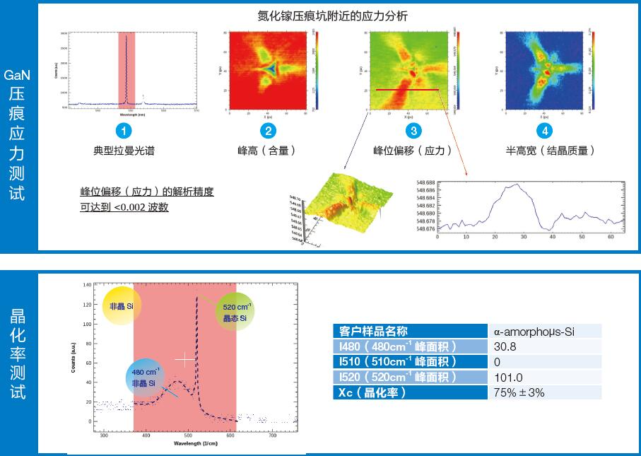 应力测试 | 可直观给出应力属性(拉力/ 张力),针对特种样品,可直接计算应力大小,应力均匀性分析 (需额外配置电动位移台), 应力解析精度0.002cm-1 |
