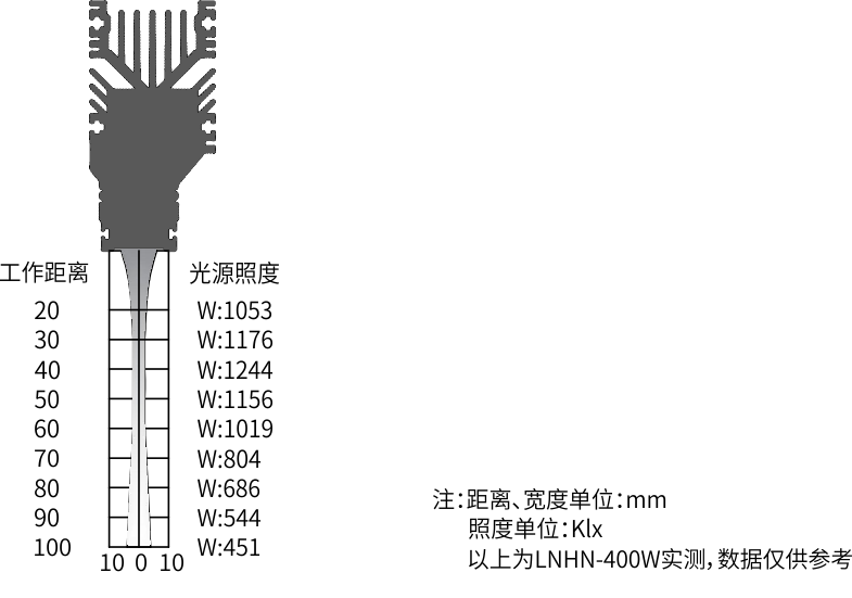 调光为100%时,工作距离50mm时的理论值,实际数值可能存在出入