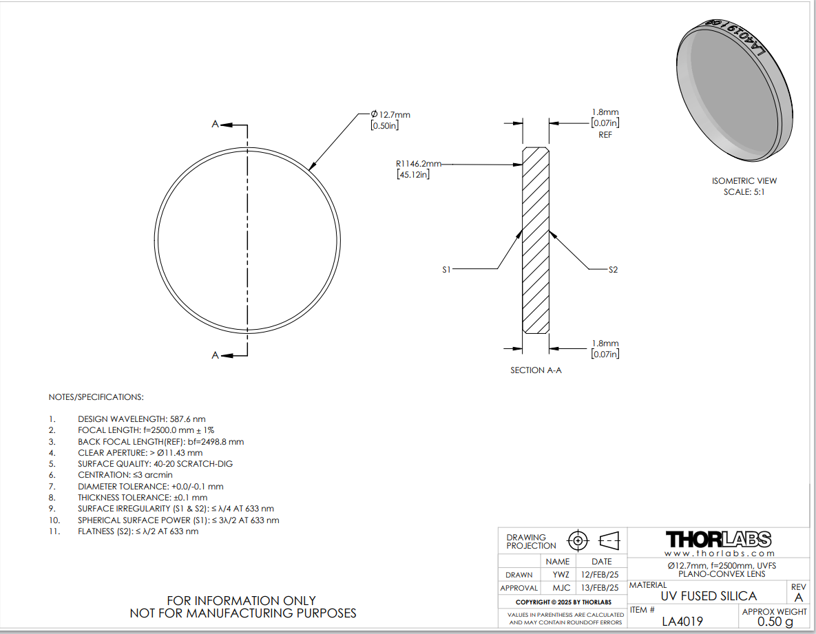 其中,n是折射率,R是透镜表面的曲率半径。这些透镜由阿贝数为67.82的紫外级熔融石英制成;阿贝数是色散指标。