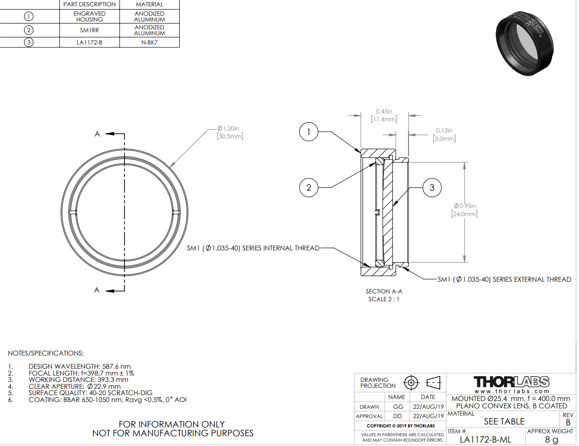 这些平凸透镜由N-BK7材料制造,它是符合RoHS标准的BK7玻璃,并且镀有增透膜,在650 - 1050 nm波长范围上提供每个表面< 0.5%的平均反射率。N-BK7是制造高性能光学元件最广泛使用的光学玻璃之一。当紫外熔融石英的额外好处(即良好的紫外透过率和较低的热膨胀系数)不那么必要时,通常会选择该材料。这些Ø1/2英寸,Ø1英寸、Ø1.5英寸和Ø2英寸的透镜分别安装在兼容SM05 -(0.535"-40),SM1-(1.035"-40)、SM1.5(1.535"-40)和SM2-(2.035"-40)螺纹的安装座上,从而兼容我们的SM螺纹透镜套管。每个透镜套筒都刻有型号,透镜类型,焦距和指向透镜弯曲表面的箭头,以及增透膜范围。
