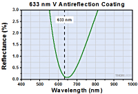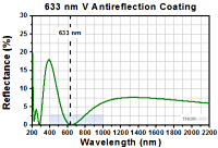 V膜是一种多层介质增透膜,它能在一个窄波长范围内获得极小的反射率。反射率在最小值的两边都迅速上升,因此反射率曲线呈“V”字形,就像下面的性能曲线图所展示的。Thorlabs V膜在镀膜波长上每面具有低于0.25%的平均反射率,设计用于0°到20°之间的入射角(AOI)。相比我们的宽带增透膜,在规定的AOI使用时,V膜能在更窄的带宽实现更低的反射率。