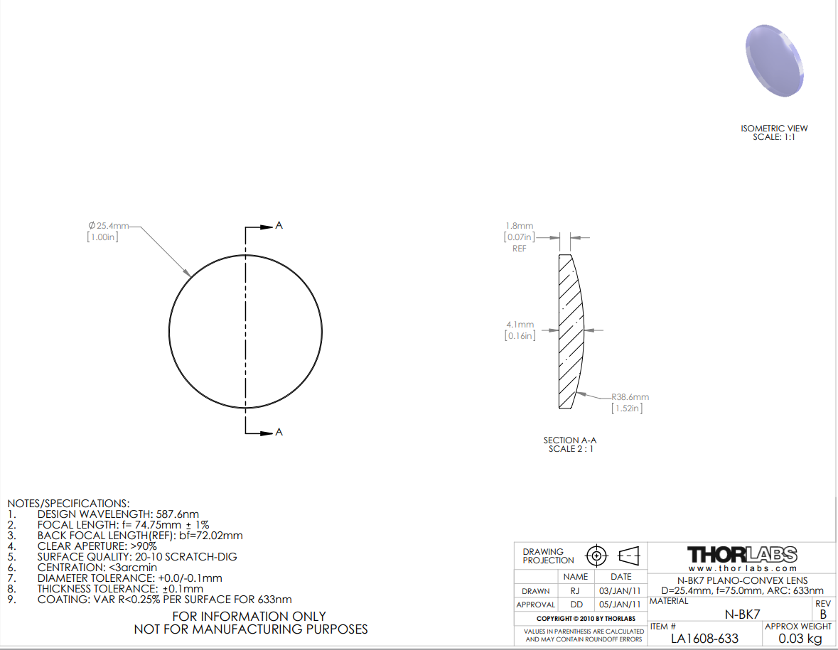 为了最小化引入的球差,在聚焦准直光束时应使其入射到透镜曲面上,而在准直点光源发出的光束时应使其入射到透镜平面上。透镜焦距可用厚透镜简化公式f=R/(n-1)计算,其中n是折射率,R是透镜凸面曲率半径。这种透镜采用N-BK7玻璃制造,阿贝数为64.17。阿贝数表征的是色散的大小。