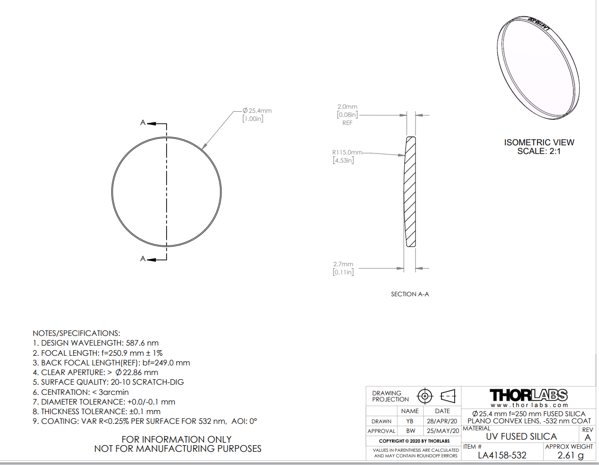 Thorlabs索雷博 LA4158-532 紫外熔融石英平凸球透镜