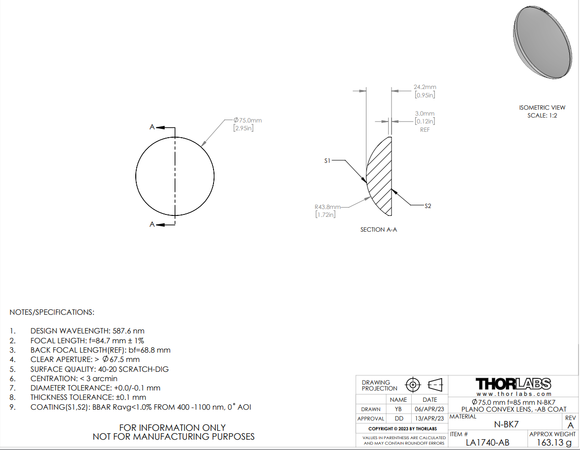 Thorlabs索雷博 LA1740-AB 平凸透镜
