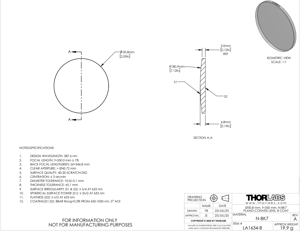 其中n是折射率,R是透镜表面的曲率半径。这些透镜使用阿贝数为64.17的N-BK7材料生产;阿贝数是色散指标。